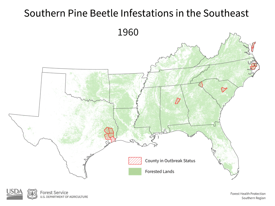 Southern pine beetle (Dendroctonus frontalis Zimmermann, SPB) is a native, eruptive forest pest that has caused significant damage to pine forests since it was first reported in the 1700’s. SPB has been found in the southeastern U.S. for decades, and was first documented as a major mortality agent in southern pine forests more than 120 years ago. Charles Zimmermann originally described the SPB in 1868, placing it in the family Hylurgidae under the tribe Hylurgi. He synonymized it with Bostrichus frontalis Fabr. in his description. This was later corrected by Le Conte (1876) and SPB was placed in the family Scolytidae. SPB is now placed within the family Curculionidae: subfamily Scolytinae. While frequent, severe, and widespread SPB outbreaks occurred throughout the Southeast in the last half of the 20th century, recent SPB activity in the region has been localized and short-lived. Reports from the mid-1800s through the mid-1900s indicated that outbreaks then were also less common.